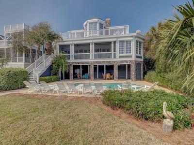 Serenity is situated on a rare double oceanfront lot, with 150 feet of the property along the Atlantic. Brand new this year: a huge new private pool with hot tub, one of the largest on the island. Serenity sits in a particularly quiet section of the IOP, so it truly lives up to its name.